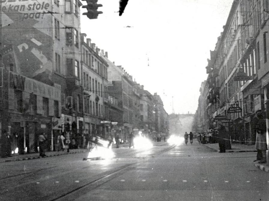 Bål på Vesterbrogade i København under folkestrejken i 1944. Foto: Frihedsmuseets fotoarkiv.