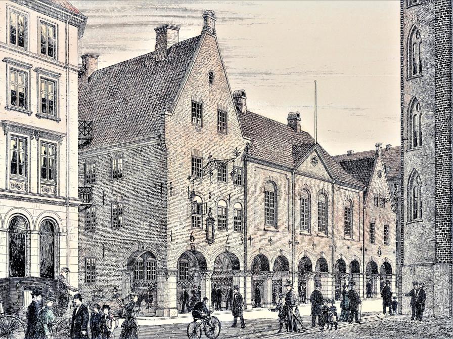 Regensen ved siden af Rundetaarn. Tegning trykt i Illustreret Tidende i 1897. Martin Borch, 1896.