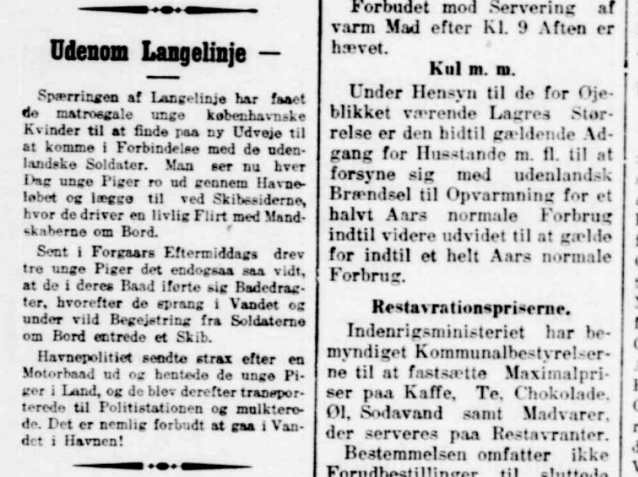 "unge piger ro ud gennem Havneløbet og lægge til Skibssiderne, hvor de driver en livlig Flirt med Mandskaberne om Bord. Sent i Forgaars Eftermiddags drev tre unge Piger det endog saa vidt, at de i deres Baad iførte sig Badedragter, hvorefter de sprang i Vandet og under vild Begejstring fra Soldaterne om Bord entrede et Skib."