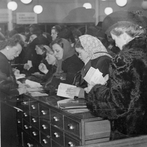 Kvinder med rationeringsmærker i hånden står i kø i Magasin. Varemangel og rationering var en del af besættelsesårene.