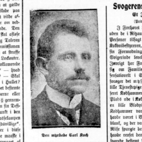 Mordet i Holsteinsgade: "Min mand er myrdet" råbte Fru Marie Koch da hun tidligt morgenen den 8. december 1912 entrede Nordre Frihavnsgades Politistation. Mordet var sket i parrets hjem, Holsteinsgade 8.