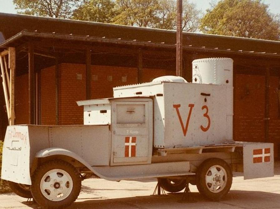Kampvognen foran Frihedsmuseet, fotograferet i 1984. Navnet på den ombyggede lastvogn var en hilsen til V1 og V2-bomberne. Foto: W. Lillegaard/Frihedsmuseet.
