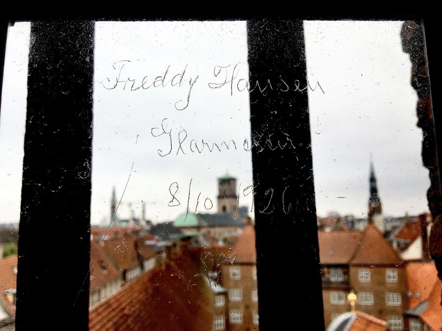 Der er, måske ikke så overraskende, en del glarmestre og glarmestersvende blandt dem, der har ridset deres navn på ruderne i Rundetaarns Sneglegang. De ældste indridsninger er fra tiden omkring år 1900. Foto: Rasmus Agertoft.
