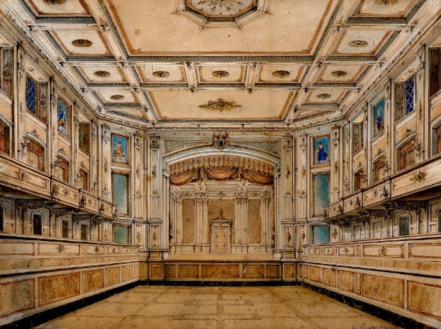 Casino-teatret på en tegning fra 1847-48, det vil sige kort tid, før Danmarks første revy blev spillet der med Rundetaarn på scenen. Foto: Teatermuseet i Hofteatret.